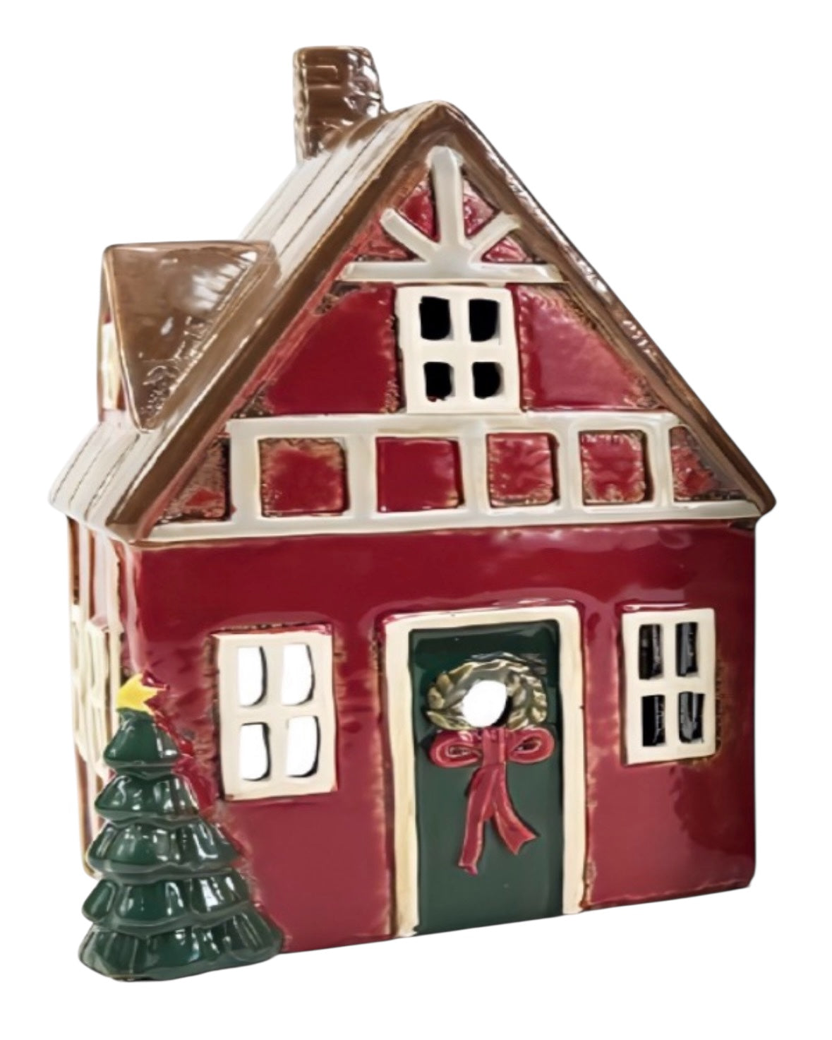 PRE ORDER - Red Pottery Christmas Tea Light House With Tree & Wreath - 2026 SEPTEMBER ARRIVAL