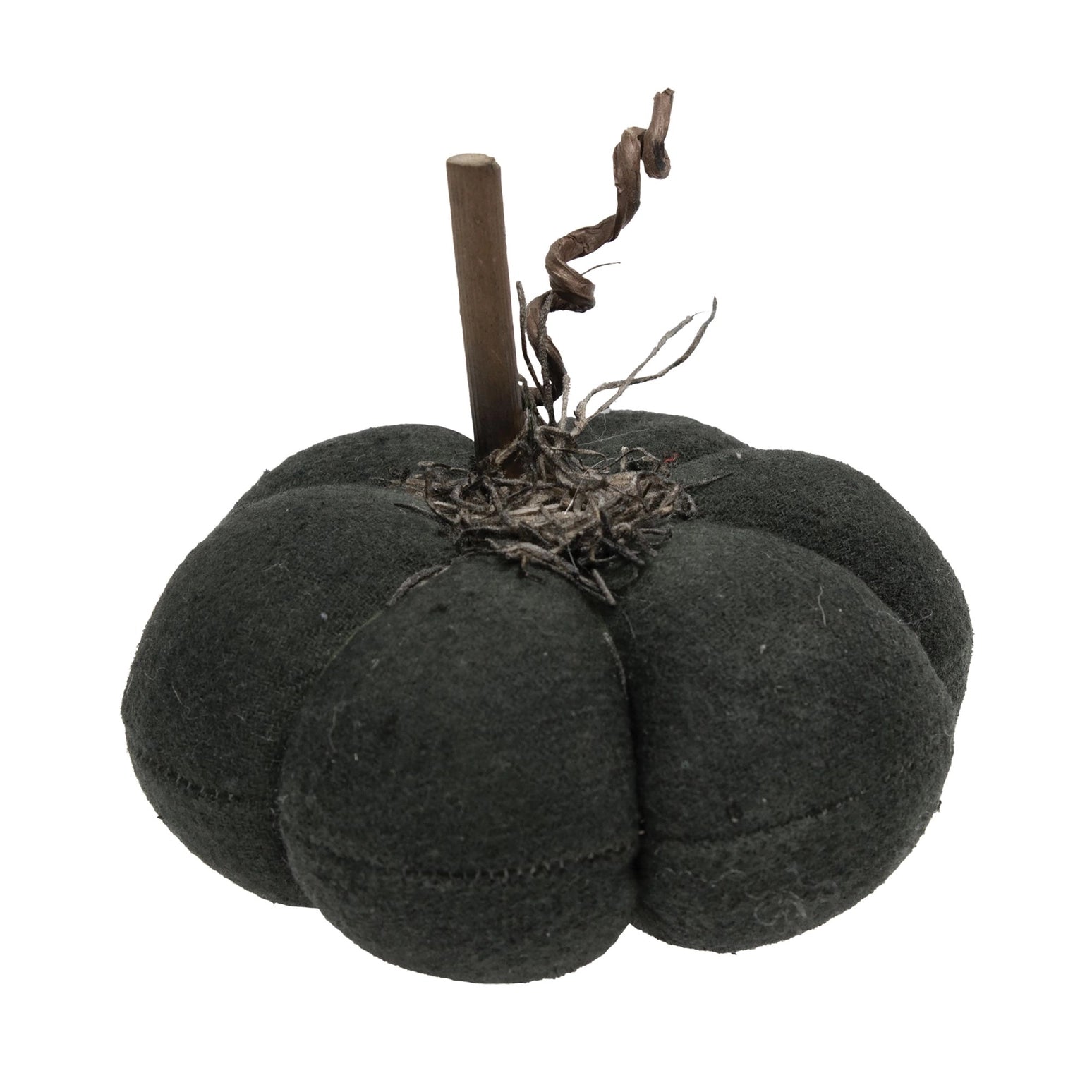 Black Distressed Fabric Pumpkin is a stuffed fabric pumpkin with a distressed black finish.