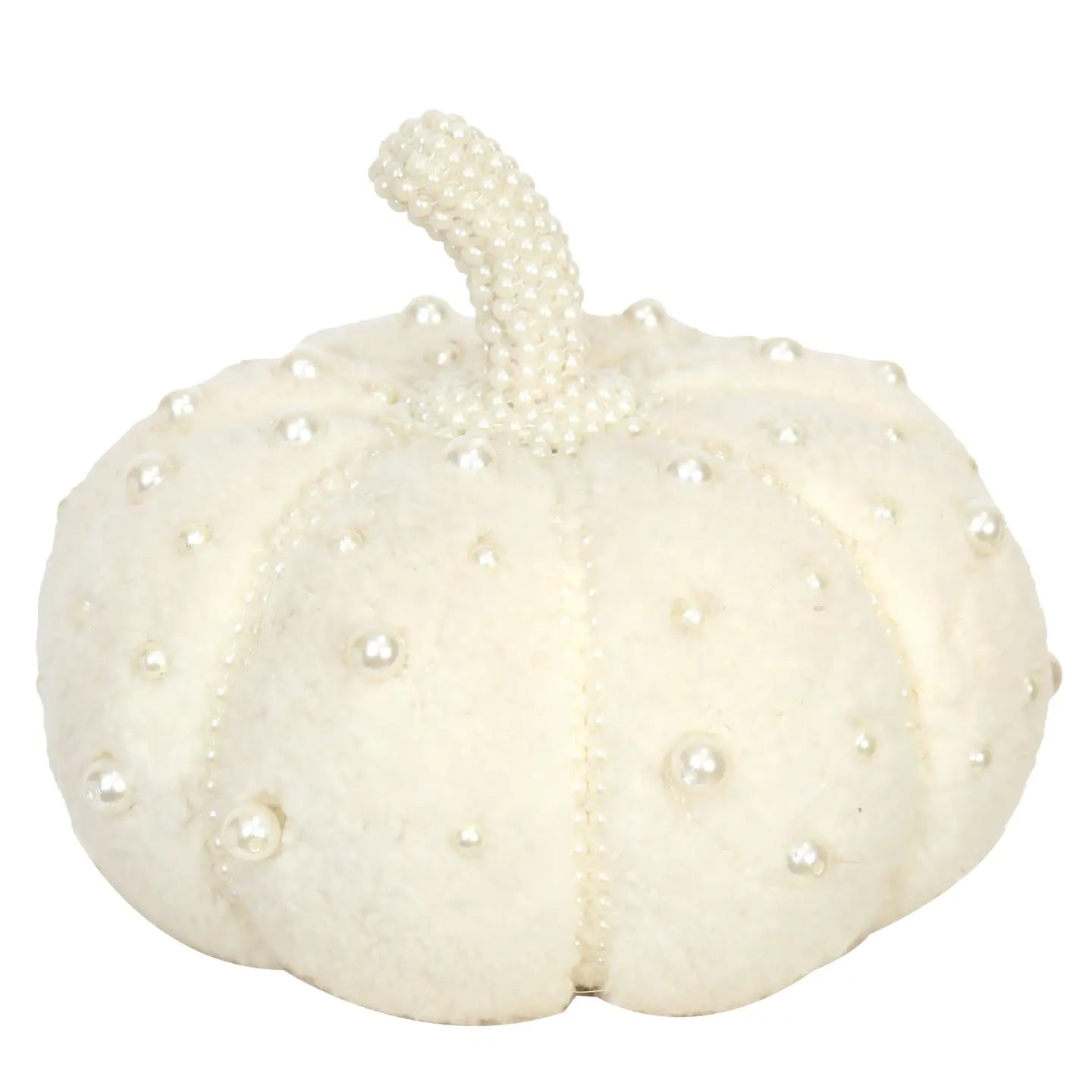 This Sherpa Pumpkin exudes elegance with its creamy ivory surface accented by pearl like beads and a textured stem.